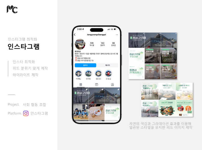 통영 사회협동조합 업체에서 의뢰주신 인스타 관리 및 최적화 건이며 자연친화적인 색감과 그라데이션 효과를 이용한 일관된 스타일을